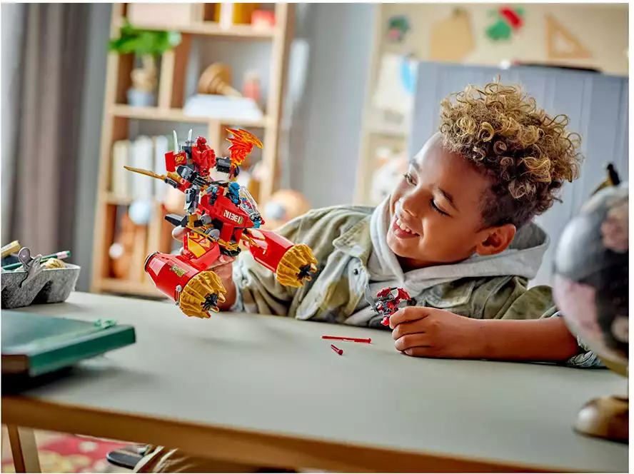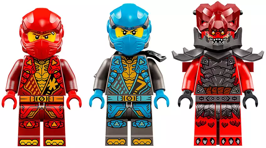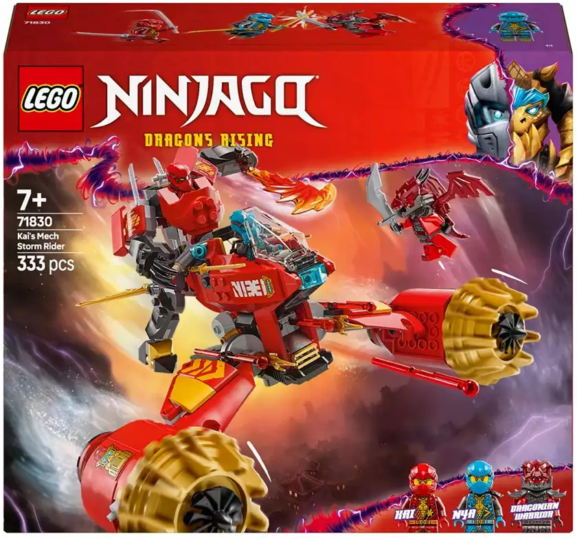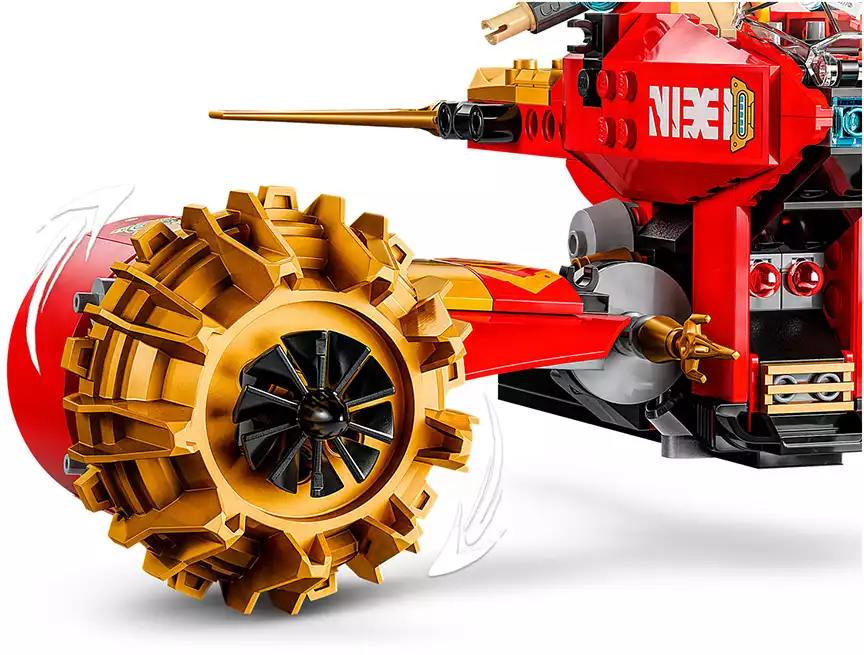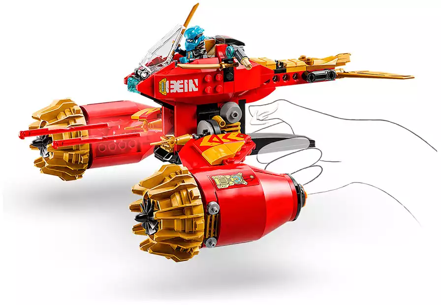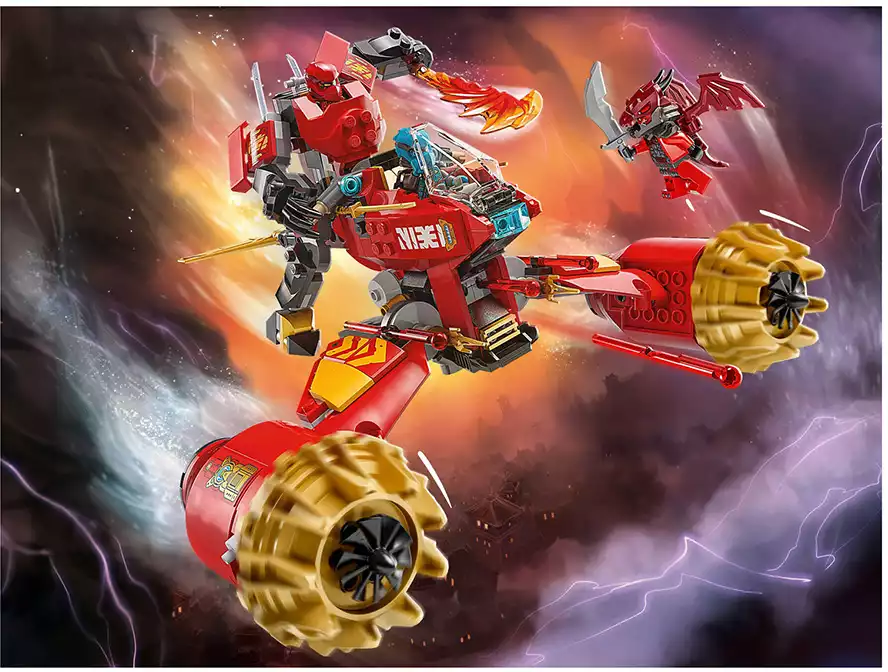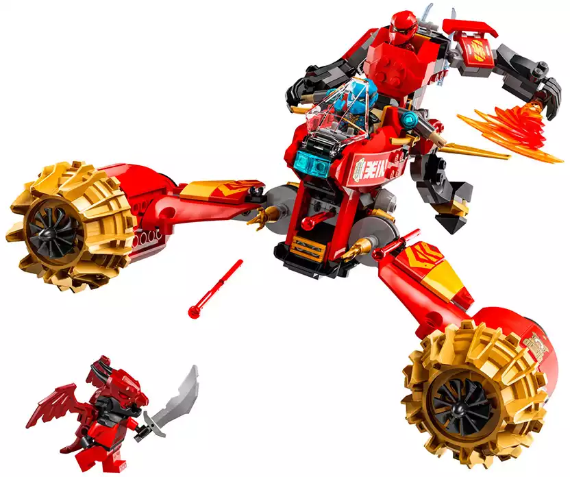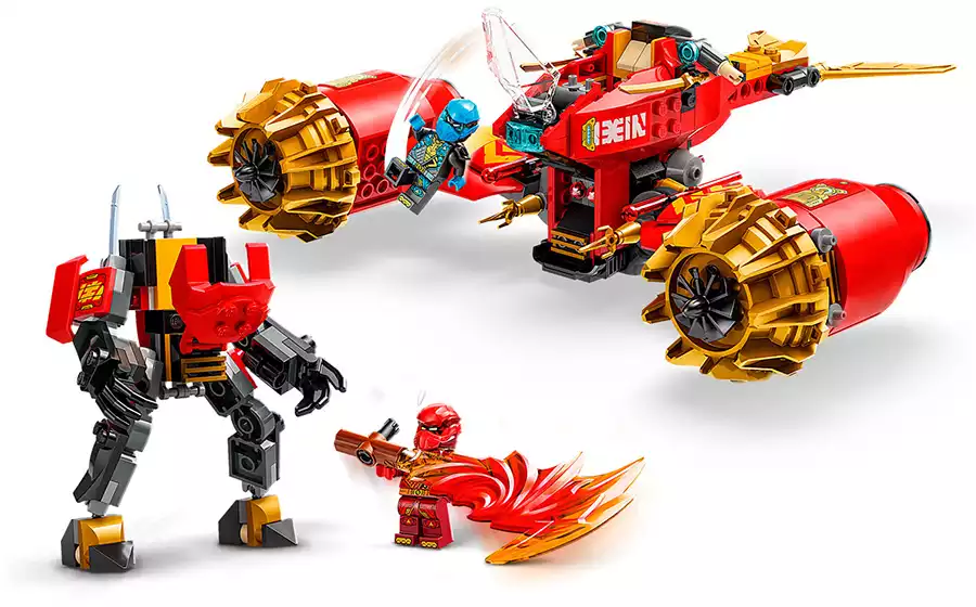 Дети могут играть с большой игрушкой-трансформером, прежде чем разделить её на 2 более мелких транспортных средства: меха Кай с подвижной головой, руками, ногами, кабиной и аксессуаром в виде штормового лезвия, а также летающий мотоцикл Нии с кабиной, подвижными крыльями и двумя пружинными пушками. В этот набор для игры с транспортом ниндзя входят 3 мини-фигурки: Кай с 2 аксессуарами в виде хрустальных мечей-катанов, Ния с 2 аксессуарами в виде золотых мечей-катанов и злодейский воин-дракон с собственным аксессуаром в виде меча, чтобы дети могли разыгрывать эпические сражения.