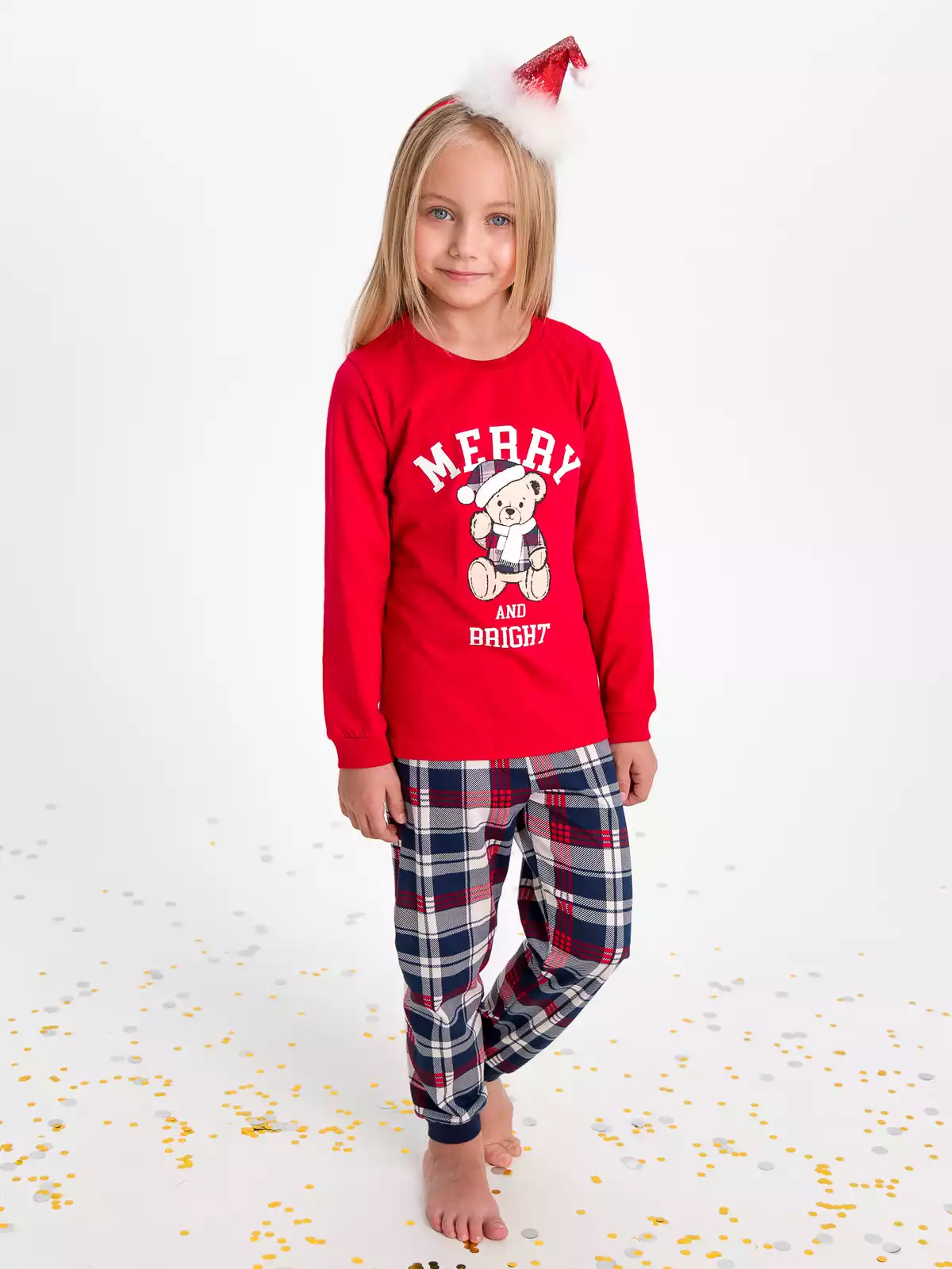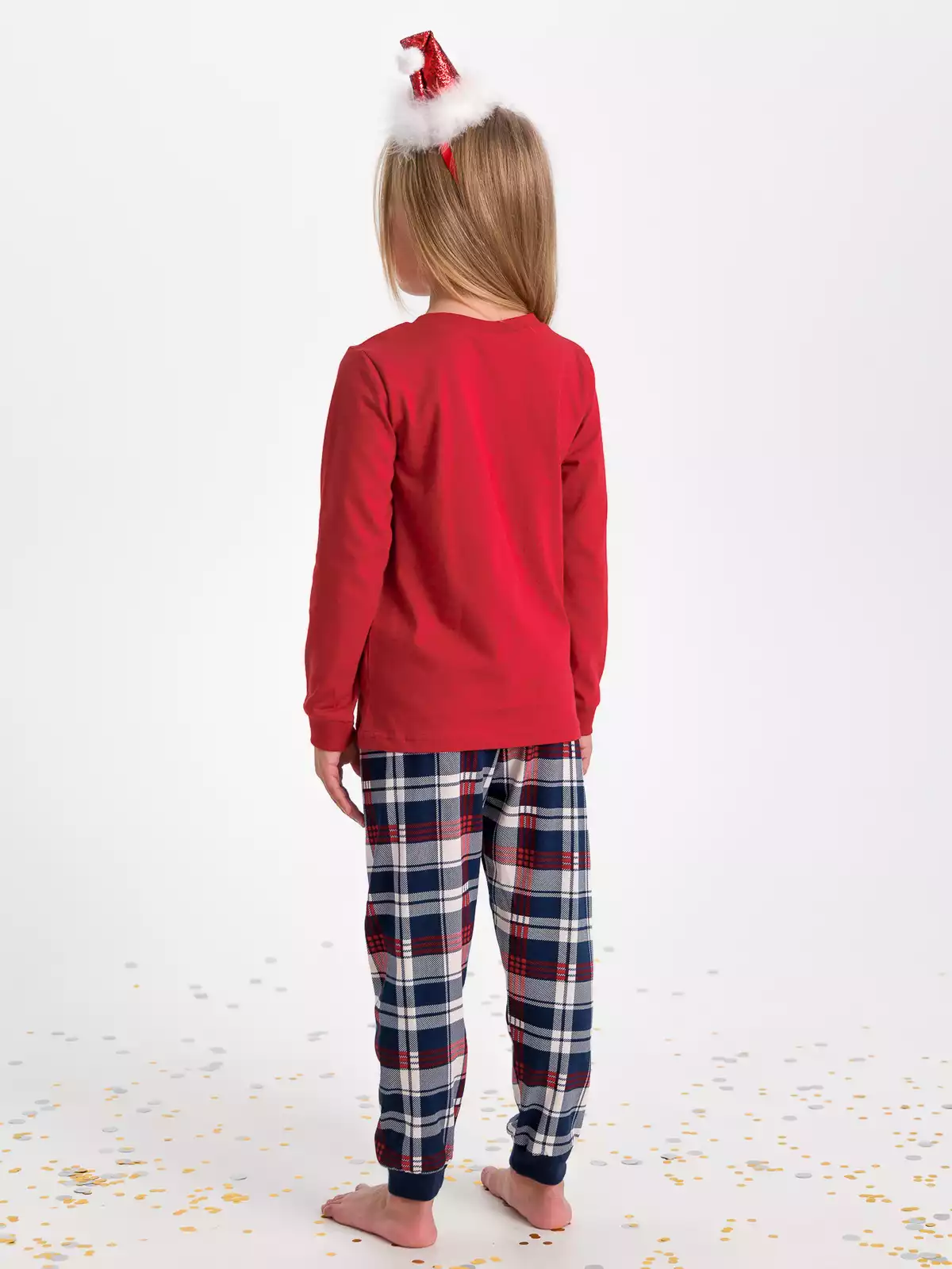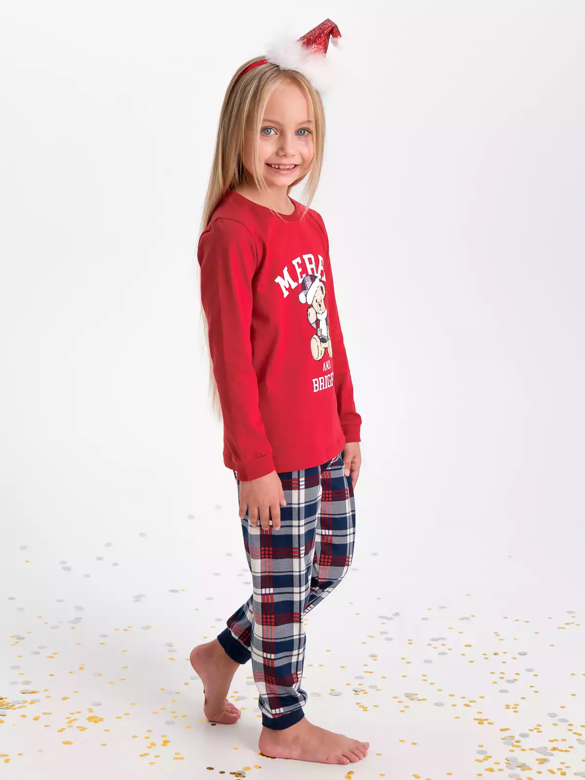 Пижама для девочки состоит из фуфайки с длинным рукавом и штанишек. Штанишки сшиты из материала с набивным рисунком. Фуфайка из однотонного материала и спереди украшена рисунком.
