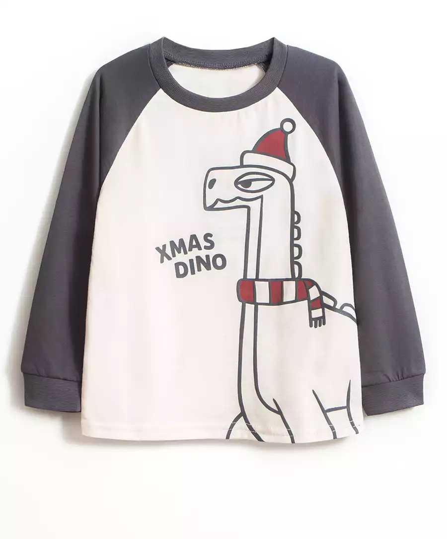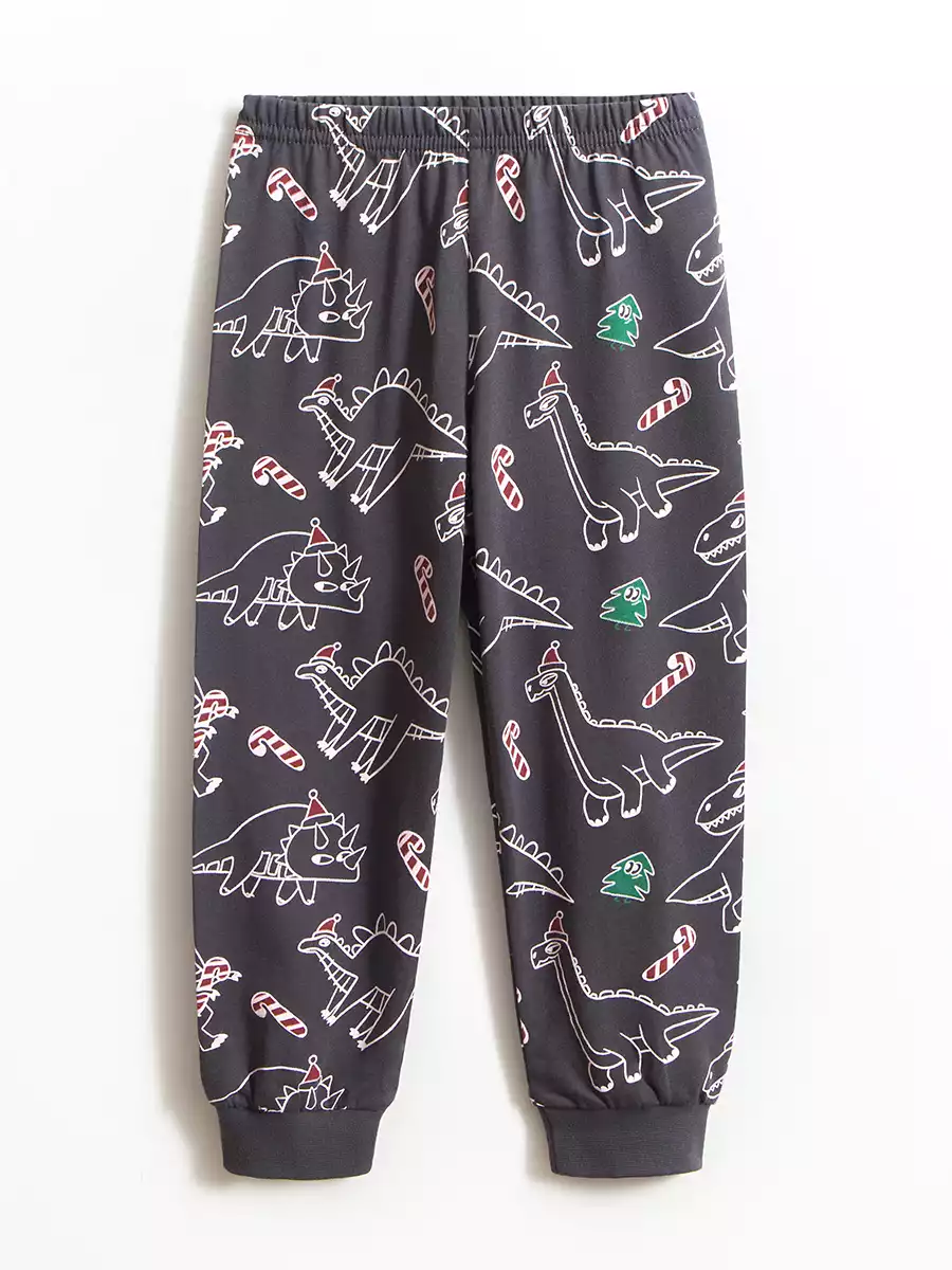 Пижама для мальчика состоит из фуфайки с длинным рукавом и штанишек. Штанишки сшиты из материала с набивным рисунком. Фуфайка из однотонного материала и спереди украшена рисунком.